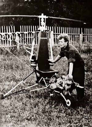 This helicopter was designed from a tubular structure attached to a seat, installed on a tricycle skeleton train. The main rotor and transmission system were attached to this seat.