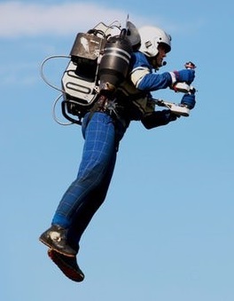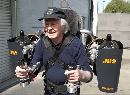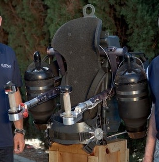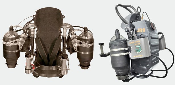It’s a jet and a backpack; that can take off vertically. There’s a large suitcase that our whole JB-9 will fit into. It’ll fit in the back of a car. The JB-9 uses a carbon-fiber corset that straps to the pilot’s back, with the majority of the “backpack” section carrying fuel. The device can carry a total of 10 gallons of fuel, which it burns at around a gallon a minute. And the fuel itself is kerosene.