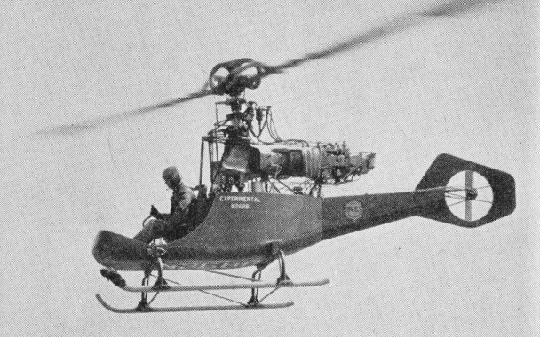 The Kaman K-17is powered by a Blackburn Turmo 600 turbine engine. This engine drives a Boeing compressor which supplies air to pressure jets at the rotor tips. The K-17 first flew in the Spring of 1958.