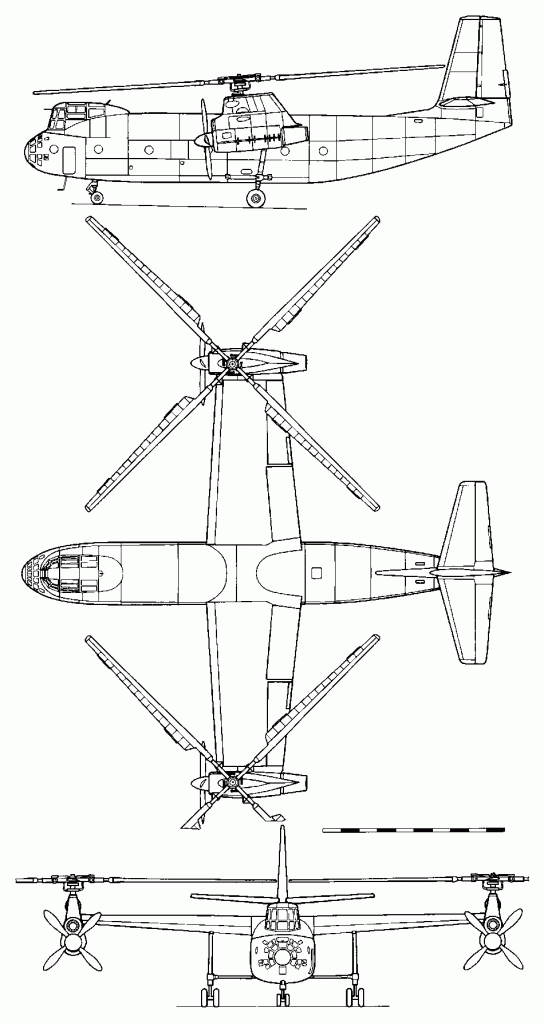 The Ka-22 was basically a stressed-skin compound helicopter with its engines on the wingtips, with geared drives to both propellers and lifting rotors. The airframe was all light alloy stressed-skin, the high wing having powered ailerons and plain flaps depressed 90° in helo mode, with auto control linking fuel flow with prop pitch in cruise. The fuselage had a glazed nose, three-seat cockpit above the nose and a main cargo area 17.9×3.1×2.8m for 80 seats or 16.5 tonnes of cargo. The entire glazed nose could swing open to starboard for loading bulky items or a vehicle. The high flight deck carried two pilots and a radio engineer. The original prototype was powered by 5,900shp TV-2VK engines, but these were later replaced by the 5,500shp D-25VK. These had free turbines geared via a clutch to the main rotor and via a front drive to the four-blade propeller and a fan blowing air through the oil cooler from a circular inlet above the nacelle. The two free-turbine outputs were interconnected by a 12-part high-speed shaft ‘about 20m long’. The propulsion system, in the form of a pair of 5600 horsepower Ivchenko turbine engines, provided the propulsive force for both the lifting flat-mounted rotors and the normally-positioned forward-pushing propellers. The tailpipes of these powerplants are assessed to have tail pipes that can be deflected downward to provide additional lift during the vertical flight phase of the trajectory. The main rotors were larger derivatives of those of the Mi-4. In helicopter mode the propeller drive was declutched and the flaps were fully lowered.
