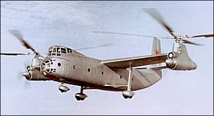 In June 1958 the LD-24 rotor blades began testing on an Mi-4. The Ka-22 itself first lifted from the ground on 17th June 1959, and made its first untethered flight on 15th August 1959, the test crew being led by pilot D. K. Yefremov. Serious control difficulties were encountered, and the Kamov team were joined by LII pilots V.V.Vinitskii and Yu.A.Garnayev. Though still full of problems the Vintokryl was demonstrated on 11th October 1959 to MAP Minister P.V.Dement’yev and VVS C-in-C K.A.Vershinin. Gradually difficulties were solved and in July 1960 an order was received to manufacture three Ka-22s at GAZ No.84 at Tashkent, with D-25VK engines.