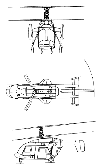 Featuring interchangeable mission pods. Refinements of the Ka-26/126 include a new rotor system with hingeless hubs and glass fibre/carbon fibre blades, changes to the shape of the nose, twin tailfins and rudders. Payload modules include an agricultural systems with a hopper capacity of 1,000 litres.