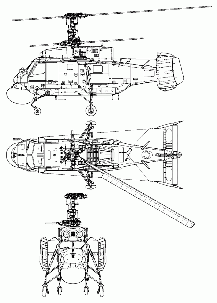ASW version. I/J-band search radar with 360 degree scan in flat-bottom radome under nose, box for three vertical sonobuoys can be clipped aft on right side. Oka-2 dipping sonar at aft end of fuselage on centerline or (seldom fitted) APM-60 MAD sensor in pod on pylon under tail, large ESM receiver drum above boom with optional ADF sense blister immediately to rear, EO viewing port under boom, upgraded EW suite. Weapon bay 0.9m wide under centerline, initially with two bulged doors, later as largely external rectangular box, tailored mainly to two AS torpedoes (originally 450mm calibre) with wire reel on left side of fuselage; alternatively nuclear or conventional depth charges or other stores, max 1.9t. Replaced in CIS Navy by Ka-27PL, but serves with India, former Yugoslavia, Syria and Vietnam. ASCC “Hormone-A”.