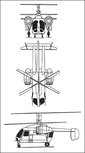 The design team was headed by deputy chief designer M.A.Kupfer; Yu.I.Petrukhin was the leading designer and V.S.Dordan the leading engineer in charge of the flight tests. Kamov opted for its standard co-axial contra-rotating twin rotor configuration, powered by a pair of 325hp / 242.5kW Vedeneev M-14V-26 radial piston engines. To leave the area under the transmission and rotor assemblies free for the payload, the engines were installed in pods at the ends of shoulder-mounted stub wings, the engines and transmission being connected by drive shafts with flexible couplings.