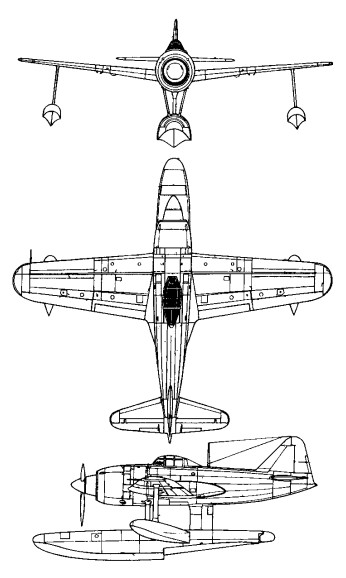 Featuring a central float and twin wing-mounted stabilizing floats, the new prototype retained the same gun armament as the A6M2 but was powered by a 1089kW Kasei 14 radial engine driving two-blade contraprops in an attempt to counter the torque-induced swing on take-off. The wing-mounted floats were originally intended to be retractable but design problems led to these being fixed before the aircraft’s first flight. Persistent trouble with the contraprop gearbox resulted in a change to the Kasei 13 engine driving a single three blade propeller from the second prototype onwards.