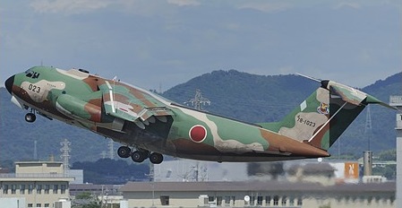 Power is provided by two 14,500 lb thrust Mitsubishi produced Pratt & Whitney JT8 M 9 turbofan engines and it can carry 60 troops, 45 paratroops, 36 stretchers, or 26,235 lb (11,900 kg) of freight (including vehicles).