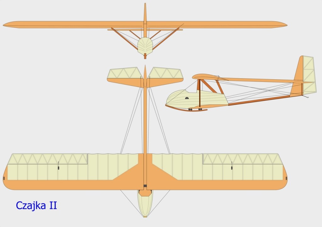 The Czajka was a single-seat, high wing, open frame (uncovered flat girder fuselage} glider. The two-part wing was rectangular in plan apart from blunted, angled tips. Each part was built around a single spar placed well forward, with plywood covering around the leading edge, forming a D-box, and forward of an angled internal drag strut which ran back from the spar to the upper fuselage longeron near the trailing edge. Behind the spar and drag strut the wing was fabric covered. It was mounted on the upper longeron, with a longitudinal N-strut to the lower longeron from the spar and drag strut, and braced on each side with a single, short steel-tube from the lower longeron to the spar at about 25% span. Trapezoidal, largely constant-chord ailerons occupied more than half the span.