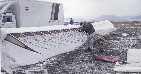 The construction was foam and glass D cell straight D cell wing. The nice feature is it allows the use of ailerons with differential throw as the lever arm from the ailerons to the CG is too short to give much pitch change – so no need for spadds, spoilerons, tip rudders or other complicated devices.