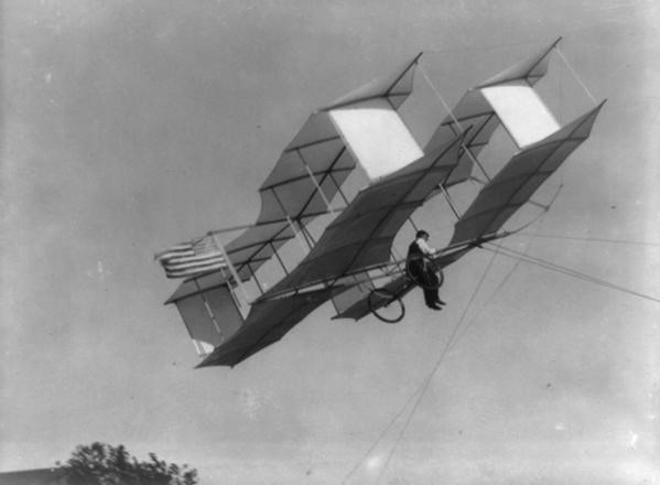 One of several kites built by American inventor Charles H. Lamson over a span of years before and after the turn of the century. The name of the man ascending in this trial in 1897 is Frederick W. Bickford, his assistant.