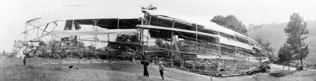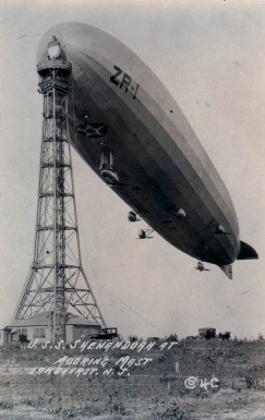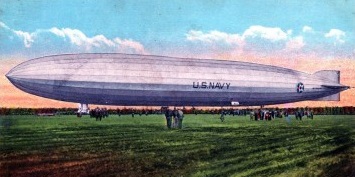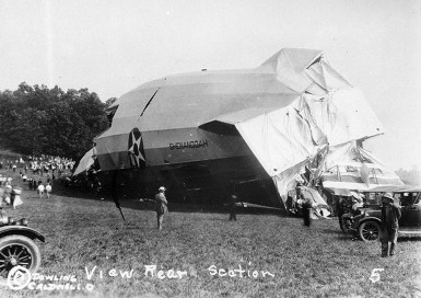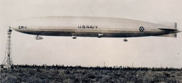 After docking at St. Louis, Commander McCrary stepped out to meet Admiral Moffet and Mayor Kiel; shown still inside the Control Car are Anton Heinen (German test pilot and consultant in the construction of the ZR1) and Cmdr Ralph D. Weyerbacher (design/build).