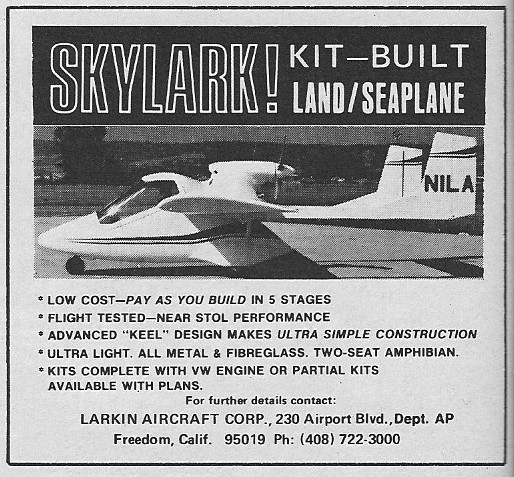 My father, Tony Austin, worked for Larkin Aircraft in the late 1960s-early ’70s. He collaborated on the engineering and fabrication of the fuselage and other structural components of the one prototype. I had opportunity as a boy to witness the Skylark’s construction and first flight, and have sat in the actual aircraft. I never flew in it as it was only ever piloted by the designer, Keith Larkin himself, to my knowledge.