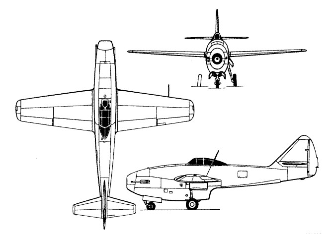 The La-152 wing, although similar in planform to that of the earlier La-150, employed a new profile of only 9.1% – the thinnest section adopted up to that time in the Soviet Union – and was lowered to mid position. The RD-10 turbojet was retained, but to avoid the duct losses suffered by the La-150, the power plant was installed in the extreme nose, exhausting beneath a sturdier rear fuselage. The CG position was restored by moving the cockpit aft, and armament was three 23mm NS-23 cannon.