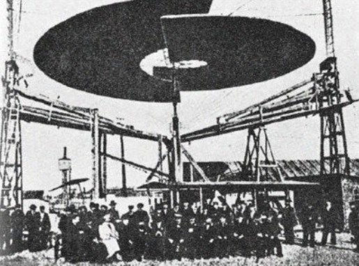 Jozef Lipkowski, a Polish engineer and inventor working in France and Russia, designed a huge helicopter-type flying machine in Russia at the end of 1904. According to descriptions in the contemporary press, the proposed aircraft featured two vertical co-axial shafts of steel tubes, to which two gigantic contra-rotating ‘screws’ (rotors) were attached. Each ‘screw’consisted of two half-circular ‘wings’ (blades) which were supported by a long steel tube and comprised a wooden ‘felloe’ and steel ‘spokes’ covered with doped silk. A nacelle, accommodating the aviators and two engines, one for vertical and the other for horizontal flight, was mounted beneath. A rudder and a propulsive airscrew on a horizontal shaft were attached to the nacelle and provided means of control.