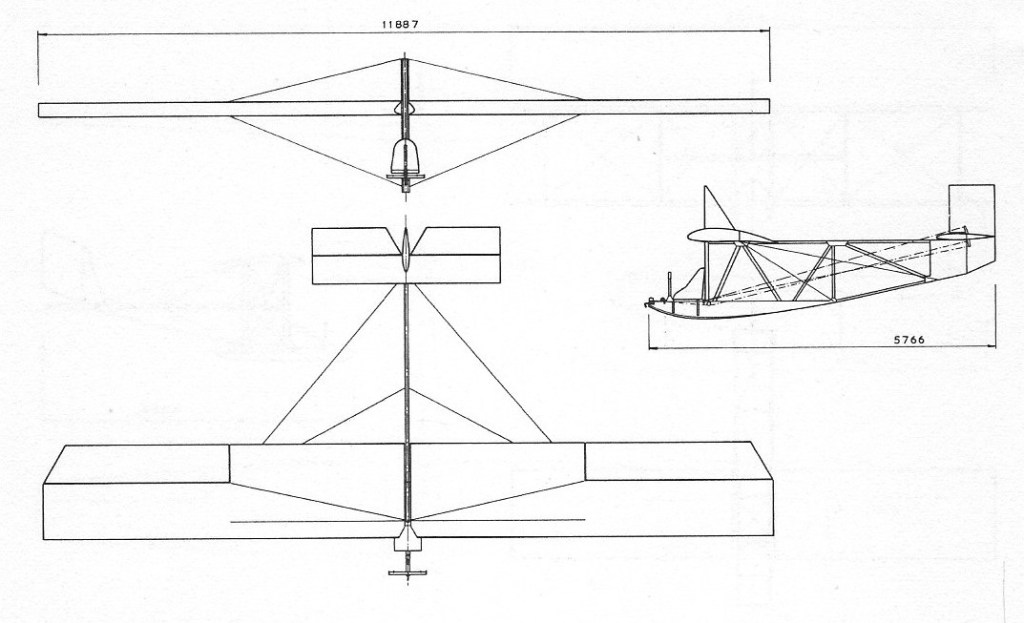 The Manuel Primary was a wooden aircraft built around an open, vertical, tapered girder with a horizontal upper member and a lower one shaped at the front into a shallow keel. The girder was strengthened with a series of vertical and diagonal cross-pieces. The keel projected forward of the foremost vertical member and carried the pilot’s seat on its upper edge. The thick-profile wing was attached to the upper part of the girder and was straight edged with constant chord apart from the angled tips of the ailerons. Extensions of two of the forward girder cross-pieces formed a triangular structure over the wing which acted as a king post for a pair of landing wires. Flying wires from the keel and the upper member about half way to the rear of the girder carried the lifting loads on the wing. There were also bracing wires from wing to the rear of the aircraft to restrain horizontal bending of the girder. The rectangular tailplane was likewise fixed to the top of the girder and carried elevators with a cut-out in which the all-moving rectangular rudder, which extended to the lower girder, could operate.