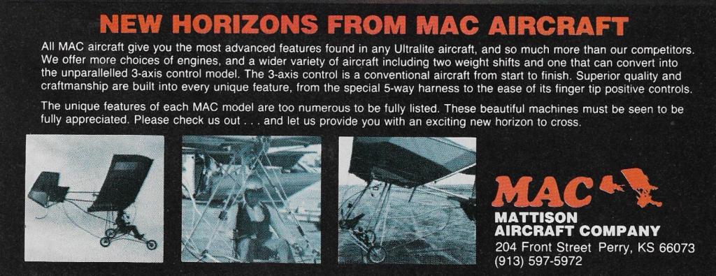 The MAC. LST-300 series three axis control ultralight, everything before this was just a prototype. All the best features, design and prices. Conventional aircraft looks and operation. Just what the conventional pilot has been waiting for. A one place aircraft anyone can afford to fly. Electric start available in 40 H.P. models.