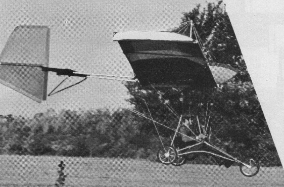 A monowing using weight shift and rudder control. The separate rudder is all flying and there are no ailerons, spoilers or wing warping to achieve roll. Construction is of aluminum tubing covered with dacron on the wings and tail surfaces. Power is a Yamaha mounted in pusher position forward of the wing. A 2:1 reduction unit turns a two-blade, wooden Ritz propeller. Fuel is carried in a plastic tank mounted above the wing. LANDING GEAR: Tricycle type shock mounted with spring action and a bicycle squeeze-type brake. The main and nose wheels are 16 inches in diameter.