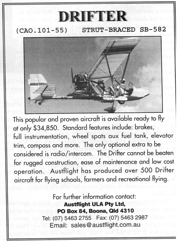Its cable-braced wing and aluminum fuselage tube resulted in a rigid design that was soon expanded to include a two-seat trainer version and a short-wing, overpowered single-seat hot rod that was well outside ultralight limits. Some Drifters were equipped with monohull or dual floats.