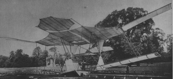 Sir Hiram Stevens Maxim (1840 1916) began building this huge aeroplane in 1891, describing it as ‘a flying machine that would lift itself from the ground’; he did not intend it to fly in the true sense. When tested in 1894, it ran along a railway track until, at a speed slightly above 42 mph (68 km/h), the wheels lifted clear of the track, fouled the guard rails placed to prevent a complete take off, and the machine had to be brought to a halt. Maxim did not pursue its development further.