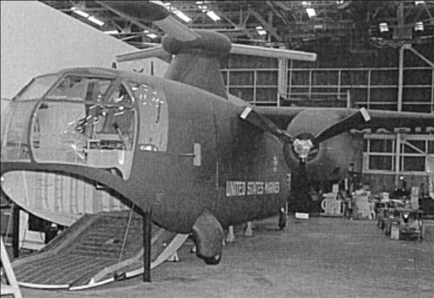 To fulfil what were then most demanding requirements, McDonnell designed a compound helicopter with a three-bladed rotor and short wings on which were mounted two 3507shp Allison XT56-A-4 turbines. For vertical flight, air from engine-driven auxiliary compressors was to be ducted to 726kg thrust McDonnell 12JP20 pressure jets, one at the extremity of each rotor. For forward flight, each engine was to drive a three-bladed propeller, with transition from helicopter flight mode to conventional flight being made by transferring power from the auxiliary compressors to the propellers as soon as the forward speed exceeded the stalled speed of the wing. Normal accommodation was to have been provided for a crew of two and 30 fully-equipped troops. Alternatively, accommodation could have been provided for 36 troops or 24 litter patients, or two Jeep-sized vehicles could have been carried internally. Larger loads (up to a maximum weight of 5224kg) could be carried externally. Another noteworthy design feature was the inclusion of a hydraulically-operated loading ramp in the forward fuselage, beneath the cockpit. Folding wings, rotor blades, and tail unit were to have enabled the Model 78 to fit on the deck elevators of CVE-105 carriers.