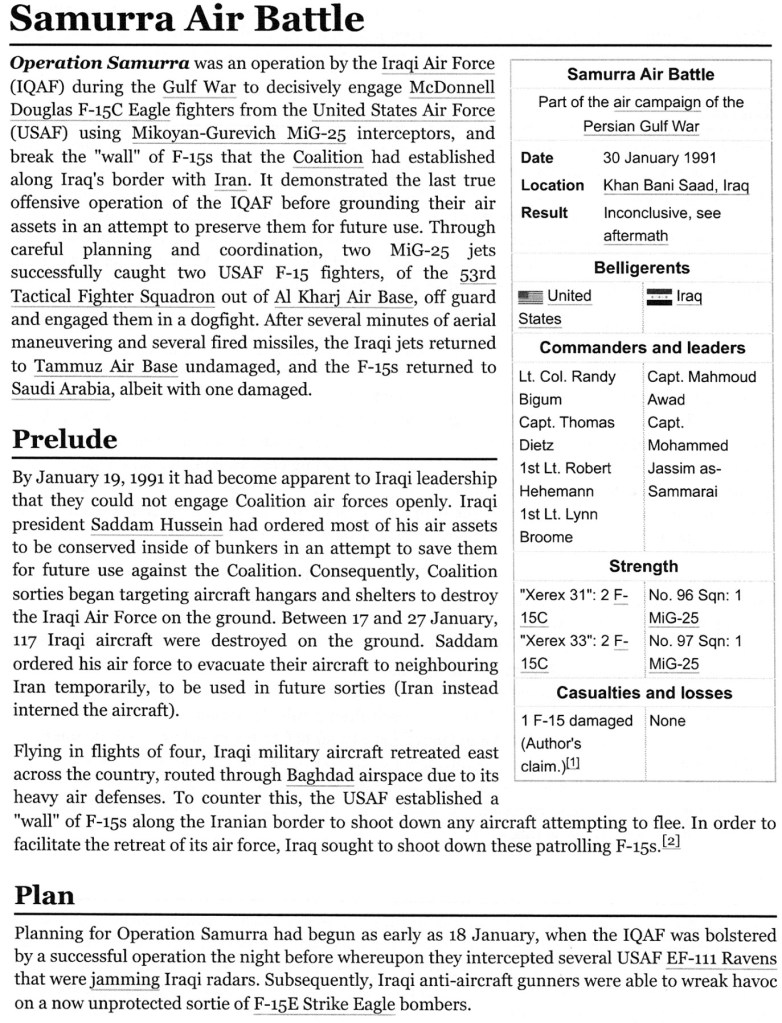 Samurra Air Battle – F-15 vs MiG-25 14/02/202518/02/2025Terry Back to McDonnell Douglas F-15 Back to Mikoyan-Gurevich MiG-25 Share this: Share on X (Opens in new window) X Share on Facebook (Opens in new window) Facebook Like Loading... Related