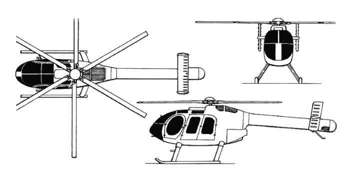 The 630N features a stretched MD 520N airframe (less than 1% new parts) by means of 0.76m plug aft of cockpit/cabin bulkhead and 0.71m plug in tailboom, combined with more powerful engine, uprated transmission and six-blade main rotor. Cabin has flat floor to assist cargo handling, and will feature quick-change interior configurations to suit multiple-use operators. Intended for civil, utility, offshore, executive transport, medevac, aerial news gathering, touring, law enforcement and other noise-sensitive operations; also adaptable for armed scout, utility and other military missions.