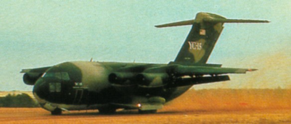 The McDonnell Douglas YC 15 first prototype (72 1875), an advanced military STOL transport, made the type’s maiden flight on 26 August 1975. Designed to contend against Boeing YC 14 pro¬totypes for the USAF’s advanced medium short take off and landing transport (AMST) requirement, it had an externally blown flap system that depended on the slipstream from four turbofan engines. The first flight was made three months ahead of schedule and the two YC-15 prototypes flew for three years before the test program ended.