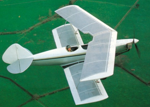 The wings, of Clark Y aerofoil, have folded aluminium channel extrusions for the spars, pressed aluminium ribs and Mylar covering, an aluminium leading edge, laced along the lead¬ing edge and each end, with the lacing covered by tips and leading edges, applied after covering. They have marked forward stagger, the bottom wing rear spar passing behind the rear seat and the top wings with a large amount of sweepback to keep the centre section well forward, clear of the front cockpit. Fuel tanks with a total capac¬ity of 50 litres are incorporated in the in¬board ends of the bottom wing leading edges.