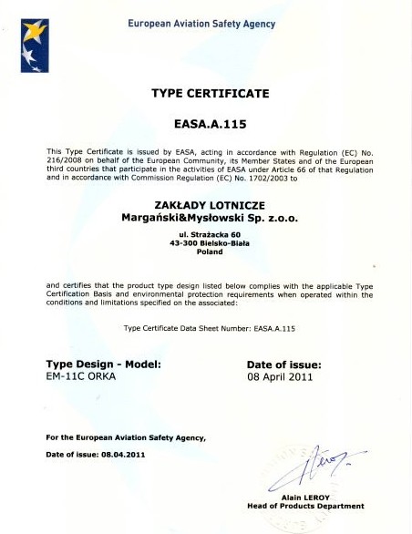 The first prototype EM-11, registered SP-YEN, first flew on August 8, 2003. It has a fixed tricycle landing gear and Rotax 912 (100 hp) engines. The second prototype, registered SP-YEP, being a pattern for serial production variant EM-11C, flew 20 October 2005 with Lycoming IO-320 engines and retractable landing gear. In April 2011 EM-11C Orka was EASA certified and in production. Prior to certification, the prototypes and three further aircraft had been built.
