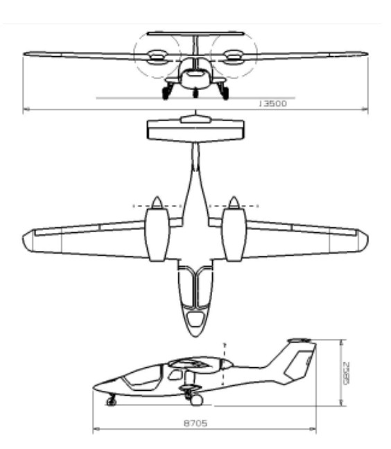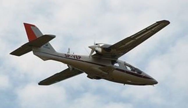 A four seater twin-engine aircraft with retractable landing gear, high-wing configuration, the shell structure is all-composite with honeycomb filler. Wings have foldable tips for easier hangaring. Two fuel tanks of 200 litres capacity each are installed in wings. Fuselage has upwards-opening door in the front part and cargo hatch in the central part. Passenger cabin has four separate seats, of which the front ones are reclining and sliding. The seats have 3-point inertial safety belts. Tail plane is in T type. Electrical trimming tabs are mounted on both planes. Flight control systems are controlled by a rigid push-rod transmission system, the rudder is controlled with use of a line. The aircraft is propelled by two counter-rotating engines LYCOMING IO-320 / LIO-320 of 160 hp each at 2,700 RPM. 3-blade constant-speed type MT-Propeller propellers are fitted. Hydraulically retracted landing gear is mounted on fuselage and has gas shock absorbers with hydraulic damping.