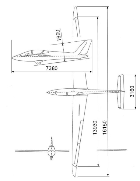 Utility – with wing-tips extending wing span to 16,15 m. Glider in this version can perform only basic aerobatic manoeuvres. Wing-tips with elliptical sweep and dihedral lift based on an arc.