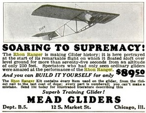 The “Rhon Ranger” is a type of primary glider (or Zogling variant), designed in Europe, for which plans were published in America in the 1930s. In America it is called the “Mead” primary glider after the Chicago firm that marketed Rhon Ranger kits and plans there.