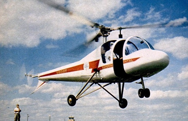 The Heli-star is a two place, homebuilt three rotor helicopter designed by Mike Meger, flight director of Enstrom.