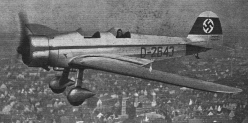 The aircraft was first shown to the public and potential buyers at the 1934 Aerosalon in Geneva. In that year, Rudolf Hess won the Zugspitz trophy in a M.35. In 1934-1935, Wilhelm Stör won the German Aerobatic Championship in a M.35b, and in 1935 the women’s prize was taken by Vera von Bissing in a similar machine. Stör can be seen flying an M.35 in daring acrobatic maneuvers during the 1935 German film Wunder des Fliegens (Miracle of Flight).