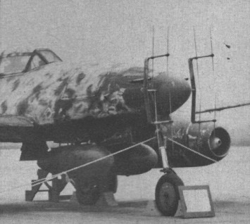 The Me 262B-1a/U1 was used for trials of the Lichtenstein SN-2 (FuG 220) interception radar and Hirschgeweih antennae, equipped with twin under fuselage auxiliary fuel tanks.