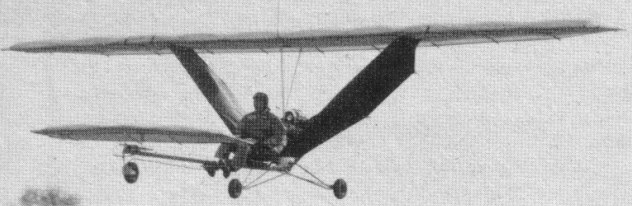 Single seat single engined high wing mono¬plane with additional dihedral wings; unconventional three axis control. main wing has unswept leading and trailing edges, and constant chord; no tall, canard wing. Pitch control by fully flying canard; yaw/roll control by control surfaces on dihedral wings; control inputs through stick for pitch/yaw/roll. Main wing braced from below by dihedral wings. Wing profile; double surface. Undercarriage has three wheels in tricycle formation; rubber suspension on main wheels. Push right go-right nosewheel steering independent from yaw control. No brakes. Aluminium tube framework, without pod. Engine mounted below main wing driving pusher propeller. Tubing in 6061T6 aluminium, anodized. Stainless steel cables. Dacron wing covering.