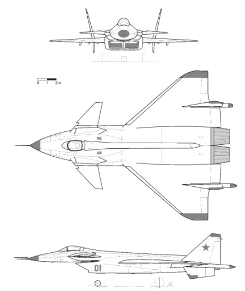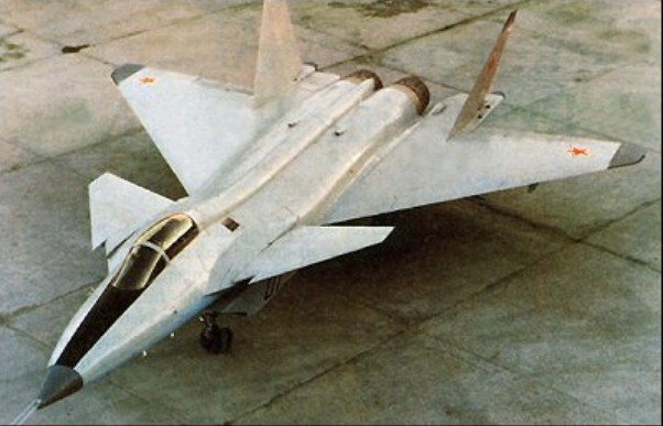 The aft fuselage is dominated by the paired and closely spaced Lyulka/Saturn AL-41F afterburning turbofans. These were to be fitted with circular thrust vectoring nozzles, which would be limited to 2D vertical vectoring should the tailboom arrangement be retained for production aircraft. The large single mainwhhels retract forward into the fuselage, close to the wing roots. The fuselage geometry provides for a modest inlet tunnel S-bend, which will reduce the inlet tunnel and compressor face RCS.