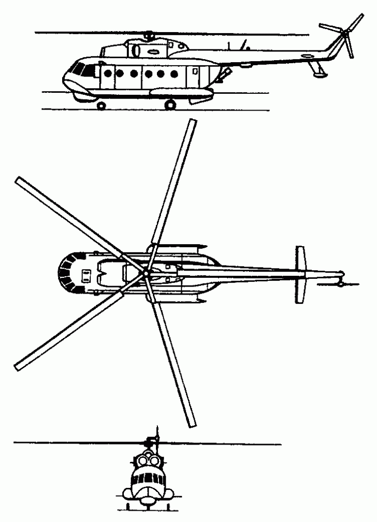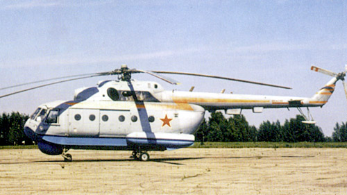 The prototype SSSR-11051, initially designated V-8G, then designated V-14, was first flown in September 1969 with a redesign watertight hull and sponsons containing fuel and a retractable undercarriage and with Mi-8 power plant. The sponson carry inflatable flotation bag each side at rear and small float the under tailboom. It has marine-type rudders on either side of the aft portion, into which the rear landing gear units retract. Two forward-retracting single-wheel nose units and two rearward-retracting twin-wheel main units. A fairing for the search radar is fitted under the nose, and a dipping sonar or magnetic anomaly detector beneath the root of the tail boom.