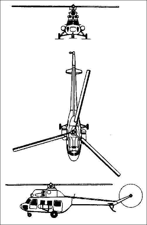 The three-blade main rotor has hydraulic blade vibration dampers; flapping, drag and pitch hinges on each blade; anti-flutter weights on leading-edges, balancing plates on trailing-edges. Coil spring counterbalance in main and tail rotor systems; pitch change centrifugal loads on tail rotor carried by ribbon-type steel torsion elements. Blades do not fold; rotor brake fitted. Main rotor blade section NACA 230-12M. Main rotor shaft driven via gearbox on each engine; three-stage WR-2 main gearbox, intermediate gearbox and tail rotor gearbox; main rotor/engine rpm ratio 1:24.6, tail rotor/engine rpm ratio 1:4.16; main gearbox provides drive for auxiliary systems and take-off for rotor brake; freewheel units permit disengagement of failed engine and autorotation.