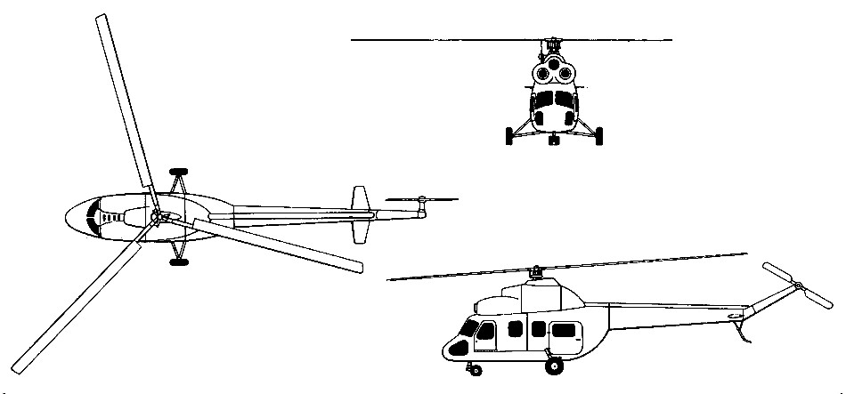 The smaller size of the Allison 250-C20B, compared with the Isotov GTD-350P used on the Mi-2, has made possible a smaller engine installation, and the opportunity has also been taken to recontour the nose. Rotor diameter has been increased by 6cm compared with the 14.5m of the Mi-2. The overall effect has been a reduction in empty weight of 262kg, though maximum take-off weight falls by only 150kg.
