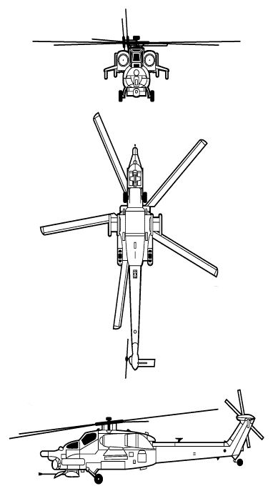 Each prototype different with the first and second (022) having upward-pointing exhaust diffusers and fixed undernose fairing for electro-optic equipment. The first also had conventional three-blade tail rotor, the second replaced this with the definitive “Delta-H” configuration. The first two prototypes were powered with 1,434kW TV3-117BM engines and VR-28 gearbox.