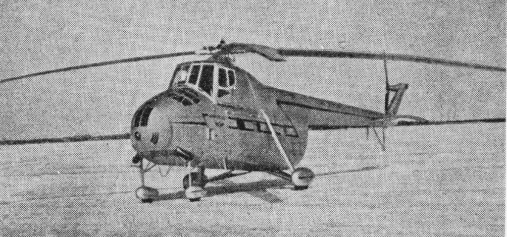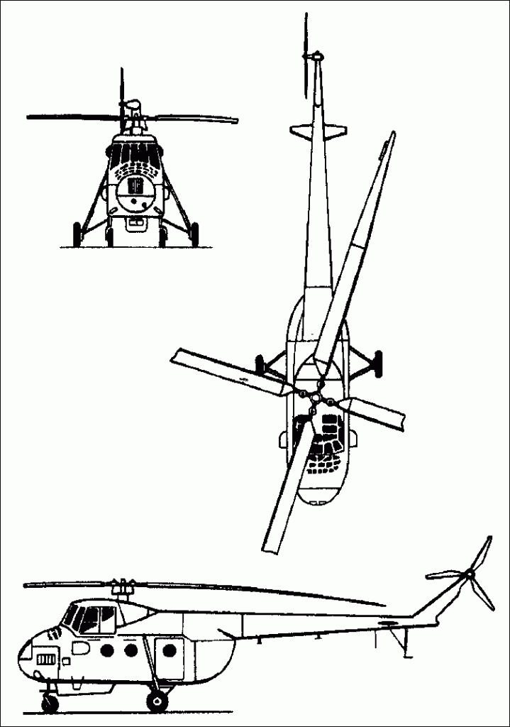 At a Kremlin meeting of constructors in September 1951 Stalin insisted on sudden great advance in Soviet helicopters. On following day Mil and Yakovlev were given one year to design, build and fly prototypes, Mil’s assignment being single-engined 12-passenger machine. Mil had prepared outline design beforehand which he produced at Kremlin; basically scaled-up rotors of Mi-1 with added fourth main rotor blade, rotor axis inclined forwards 5 degrees, and a fuselage of light-alloy semi-monocoque with extensive use of magnesium. The engine installed at 25 degrees in the nose, accessible through upper/lower hinged nose doors and left/right hinged side doors. Cooling fan and centrifugal clutch immediately to rear of engine, with inclined shaft between pilots to main gearbox. Separate cooling systems for oil radiator and hydraulics for flight control. Straight tail boom with adjustable stabilizers, deep skid/bumper and narrow fin carrying tail rotor on right, with three bakelite-ply blades. Main fuel tank welded aluminium, 960 lit, behind gearbox; optional aux tank 500 lit in hold or externally. Quad landing gear with pneumatic-braked mainwheels and castoring nosewheels, optional pontoons for water. Main hold 4.15m long, about 1.8m square section. Max internal load 1740kg including small vehicles loaded through left/right rear doors and clip-on ramps. Slung load to 1.3t. Alcohol de-icing of blades and windscreens as on Mi-1.