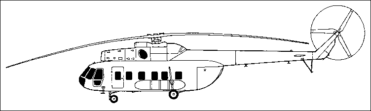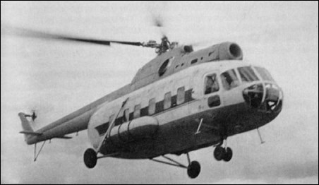 The Mi-8 prototype incorporating an Mi-4 main rotor and transmission and one 2700shp Soloviev AI-24V turbine mounted on top of fuselage. First flown on 24 June 1961 and subsequently fitted with 5-blade rotor and two 1400shp Isotov TV2-117 engines, being the standard for the Mi-8.