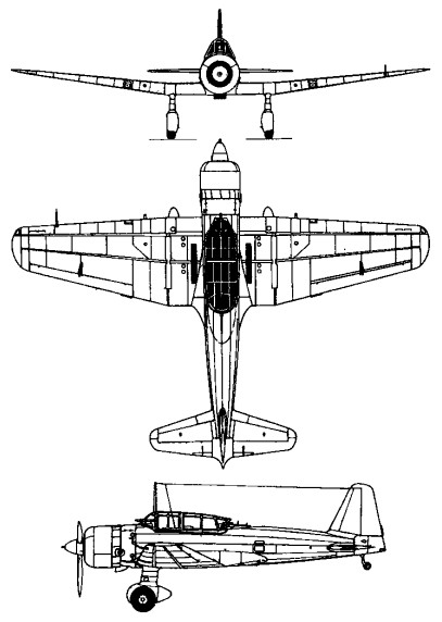 The Ki 51 was a cantilever low wing monoplane, with a ‘trousered’ and spatted non retractable main landing gear and a fixed tail wheel. The powerplant for both prototype and production aircraft was a single 940 hp Mitsubishi Ha 26 II 14 cylinder air cooled radial engine, driving a three blade variable pitch metal propeller. The greenhouse canopy was shorter than that on the Ki 30, bringing the two man crew closer together, and a degree of armour protection was provided for the occupants and the engine. The Ki 51 differed from the Ki 30 in having no internal bomb bay, the normal 200-kg (440 lb) weapon load being carried externally. Overall construction was of metal except for the control surfaces, which were fabric covered.
