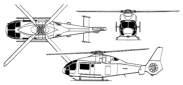 Of single main rotor configuration (four blades with tapered tips) and Fenestron-type tail rotor, the main gearbox and other drive mechanisms are in an overhead fairing located aft of the passenger cabin. There is a mid-mounted tailplane with angular endplate fins. The landing gear is a cnventional twin-skid type, and all-composites main and tail rotor blades.