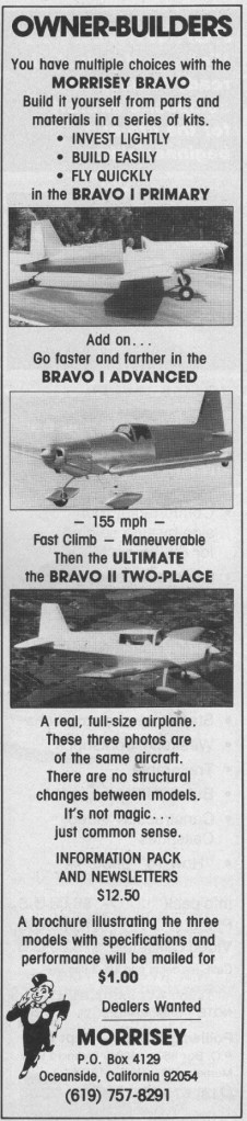 Designed by Bill Morrissey, the Bravo originated as the single-place Model OM-1, which became the two-place Bravo II in 1982. Modification was simple – no alterations to the basic structure. Instrument panel and windscreen were moved forward and the canopy extended.