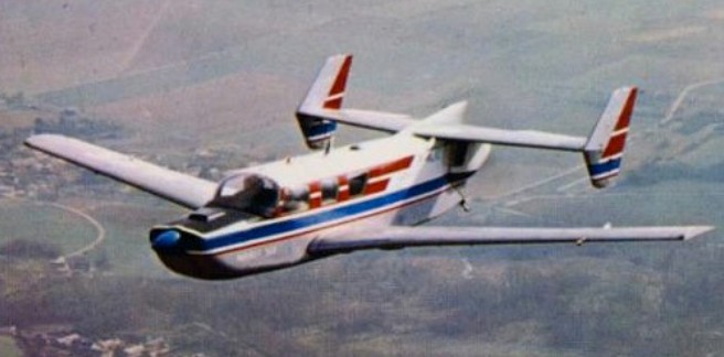 One horizontally opposed Lycoming engine was conventionally placed in the nose. Behind it was a standard cabin, though the front seats were further ahead of the leading edge than usual because of the rearward shift of the centre of gravity caused by the rear engine. There were three large windows on each side. For the same reason the rear fuselage was quite short, and it lacked the normal taper, giving it a boxy look, so that the second, pusher Lycoming could be mounted in the extreme tail. This was cooled by air from rectangular intakes on the upper sides of the rear fuselage. The straight edged, tapered tailplane was mounted on the fuselage top above the engine, with small endplate fins carrying balanced rudders. These fins extended above and below the tailplane, with arrow shaped leading edges and straight, swept trailing edges. There was also a long, shallow strake over the rear fuselage. Seen from below, the long span of the tailplane was striking, about 44% of that of the wings; the elevators filled most of the outer part of its trailing edge, avoiding the propeller airstream.