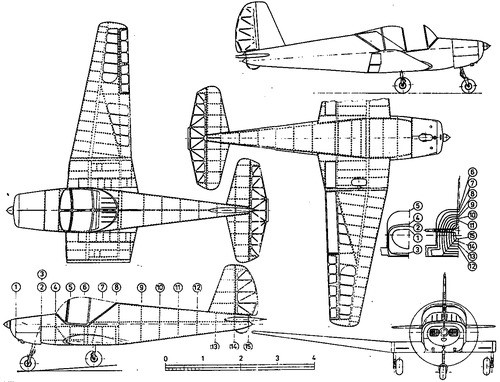 To simplify production, the wing and tail from his earlier, successful M-1C Sokol design was used. Like the Sokol, the Skaut was a wood framed, fabric covered aircraft. Their shared straight tapered wing had a swept leading edge but no sweep on the trailing edge They had marked dihedral beyond a very short centre section. The fin also had a swept leading edge and carried a rounded rudder. The tailplane was set well to the rear and near the top of the fuselage with a single piece elevator; the rudder moved above it. The Skaut had fixed tricycle landing gear.