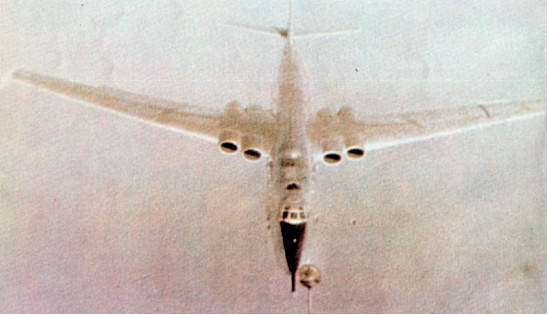 Following its maiden flight in late 1953, a single example of this large aircraft took part in the 1954 May Day parade fly past over Moscow, its size being gauged from the escorting MiG fighters. It was expected to appear in large numbers, but little was heard of it for years. In fact a useful run of about 150 had been delivered, at first being used as free fall bombers (Bison A), reaching regiments of the DA (Long Range Aviation) in 1956. Altogether about 200 were built. By 1959 the Mya-4 bombers were being fitted with more powerful engines, and their role changed from bomber to long-range over-sea reconnaissance, ECM and, in some cases, flight-refuelling tanker. Many were given different noses as ‘Bison B’ and ‘Bison C’ for maritime reconnaissance purposes. All aircraft were given large fixed FR probes, the rear turrets were removed and a vast amount of special reconnaissance equipment fitted, with from five to 17 aerials visible all over the aircraft.