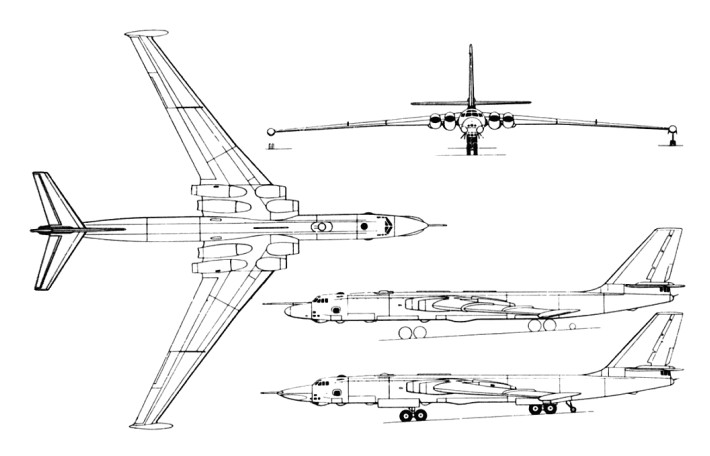 A mid-wing cantilever monoplane with a deep section swept wing, the M-4 has a tail unit with all-swept surfaces, and retractable landing gear comprising two main units in tandem on the fuselage centreline, each with a four-wheel bogie, plus twin-wheel outrigger balancing units which retract into the wingtips. The circular-section fuselage incorporates a pressurised nose compartment and tail turret for the crew, and a large internal weapons bay in the lower fuselage between the main landing gear units. The powerplant comprises four turbojets buried in the wing roots, these being initially Mikulin AM-3Ds each of 8700kg thrust.