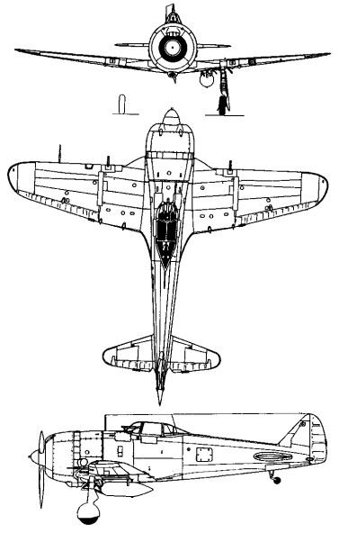 A low wing all metal cantilever monoplane, it had a deep forward fuselage tapering sharply to the tailplane, which had the fin and rudder set further back than the horizontal tail surfaces. The wing was built in three sections, with a broad centre section integral with the fuse¬lage. The undercarriage retracted inwards and the tail wheel was fully retractable. Metal stressed skin covering was employed on fuselage and wings. The combat flap intro¬duced in the Ki 43 was used on all Ki 44s built. Power was provided by a 14 cylinder two row 1250 hp Nakajima Ha 41 radial engine. Test flights were successful, although the small wing resulted in a high wing loading and a high landing speed. The Ki-44 prototypes incorporated the manoeuvring flaps that had been introduced on the Ki-43, and carried an armament of two 7.7mm and two 12.7mm machine-guns.